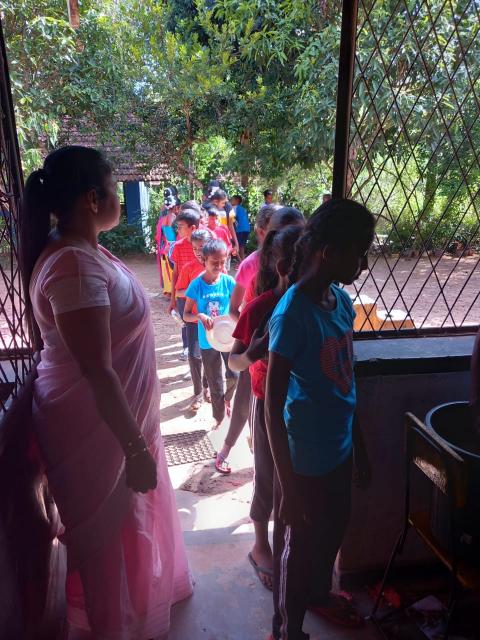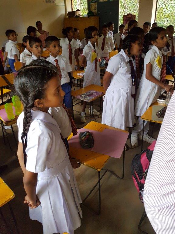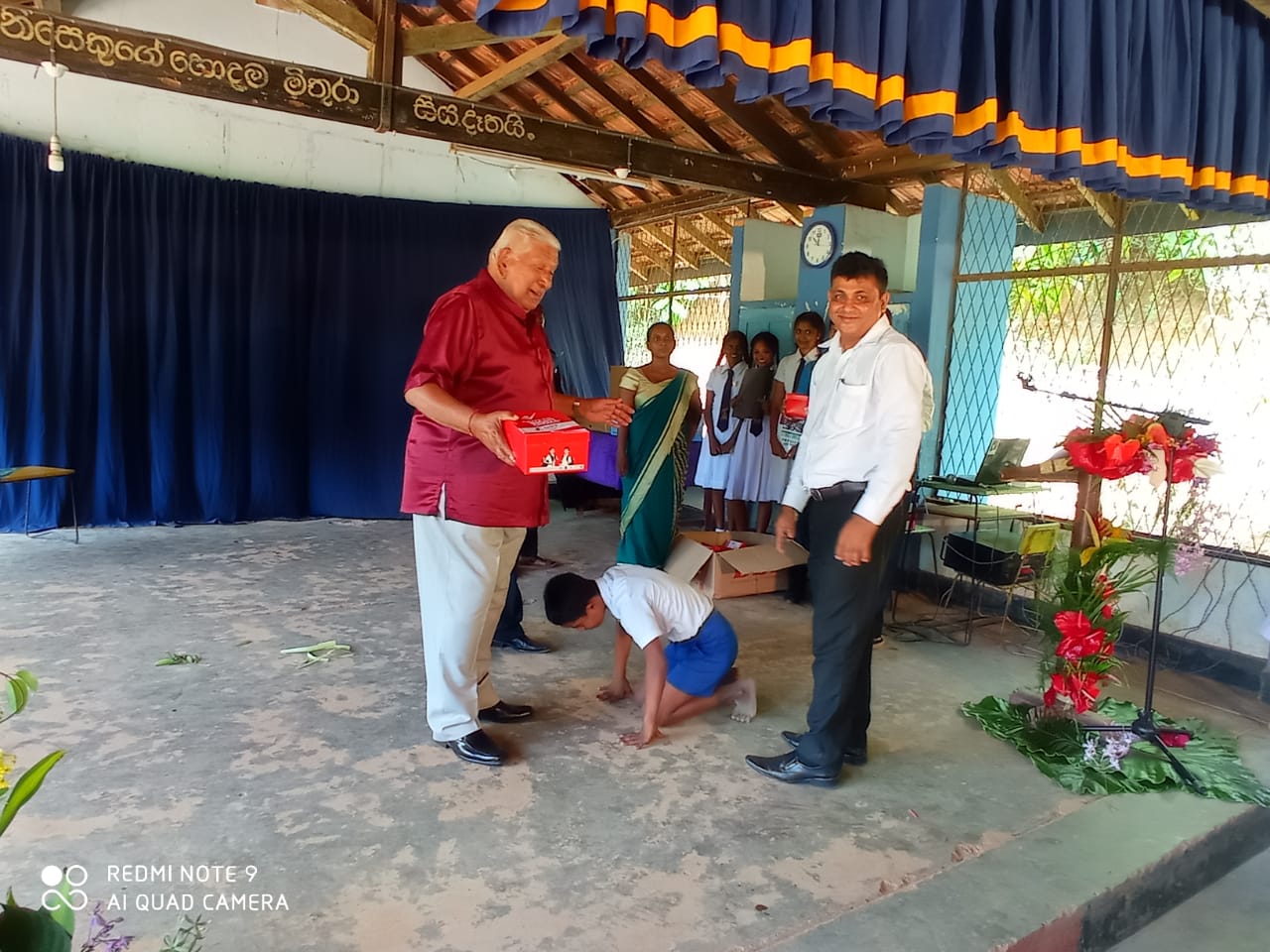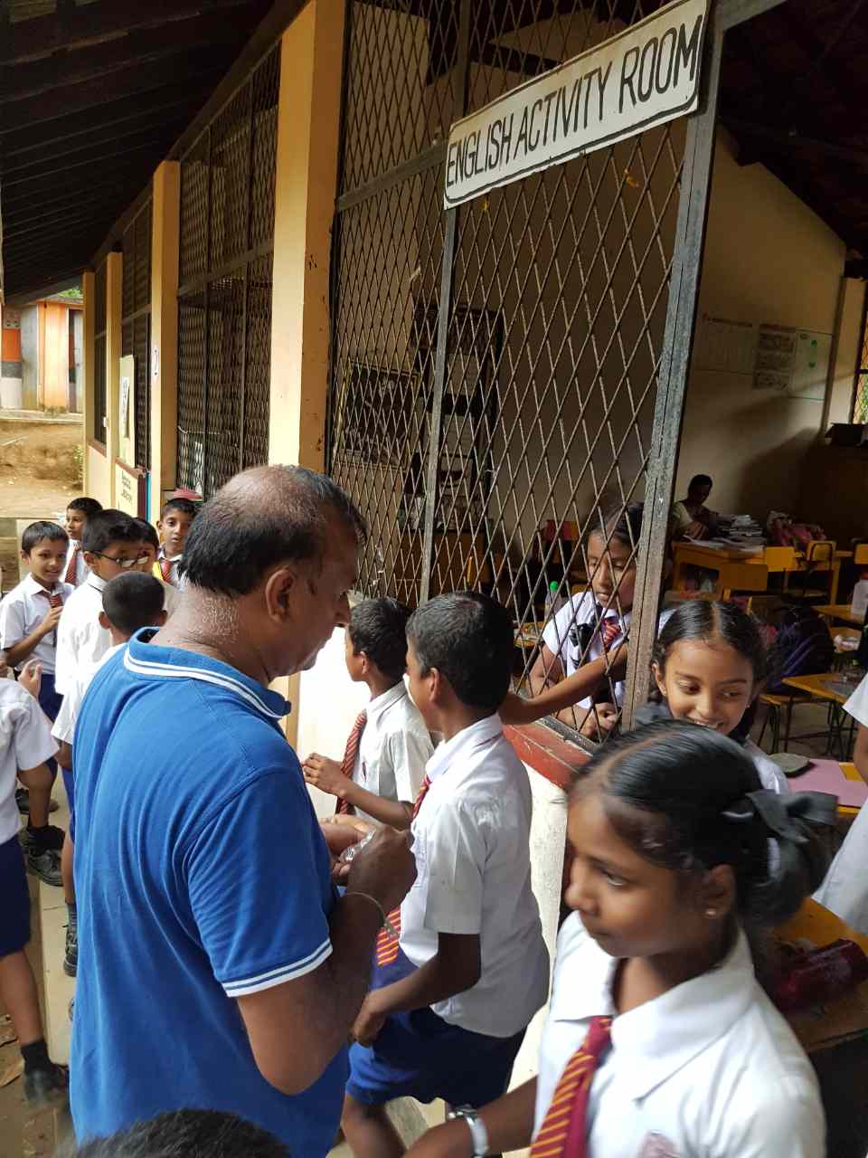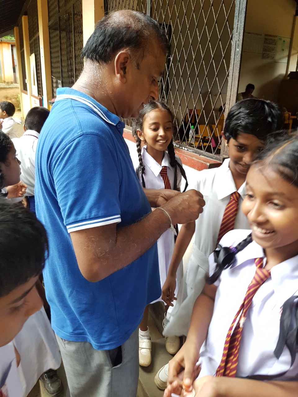 During the visit Sapugoda children were very happy to receive various gifts from Dinum. At their invitation, Dinum ran an impromptu football coaching session for the boys while the girls looked on. The cricket loving children were delighted to learn this new game called “Soccer” . At the end of the session they were delighted to receive a British coin each from Dinum . Addressing the children, the Seylan bank manager Mr Sanjeewa promised to help the schools with facilities in the future.
