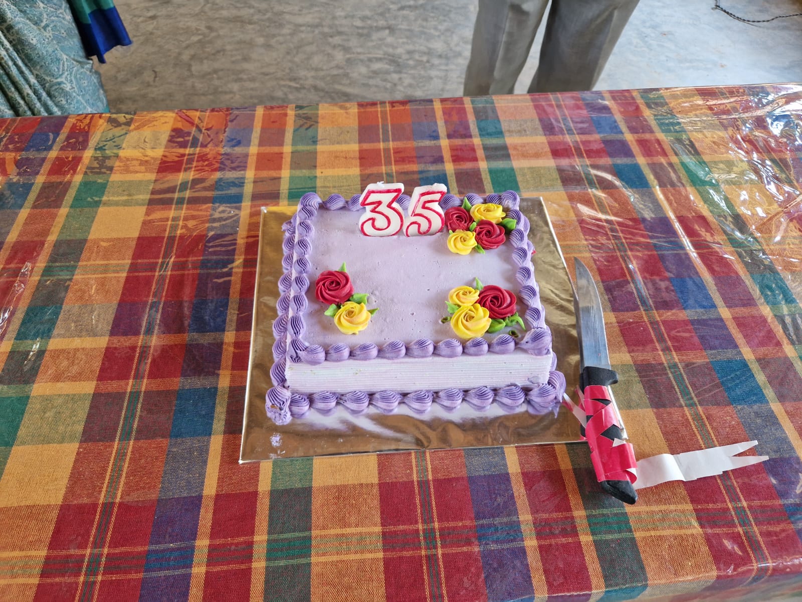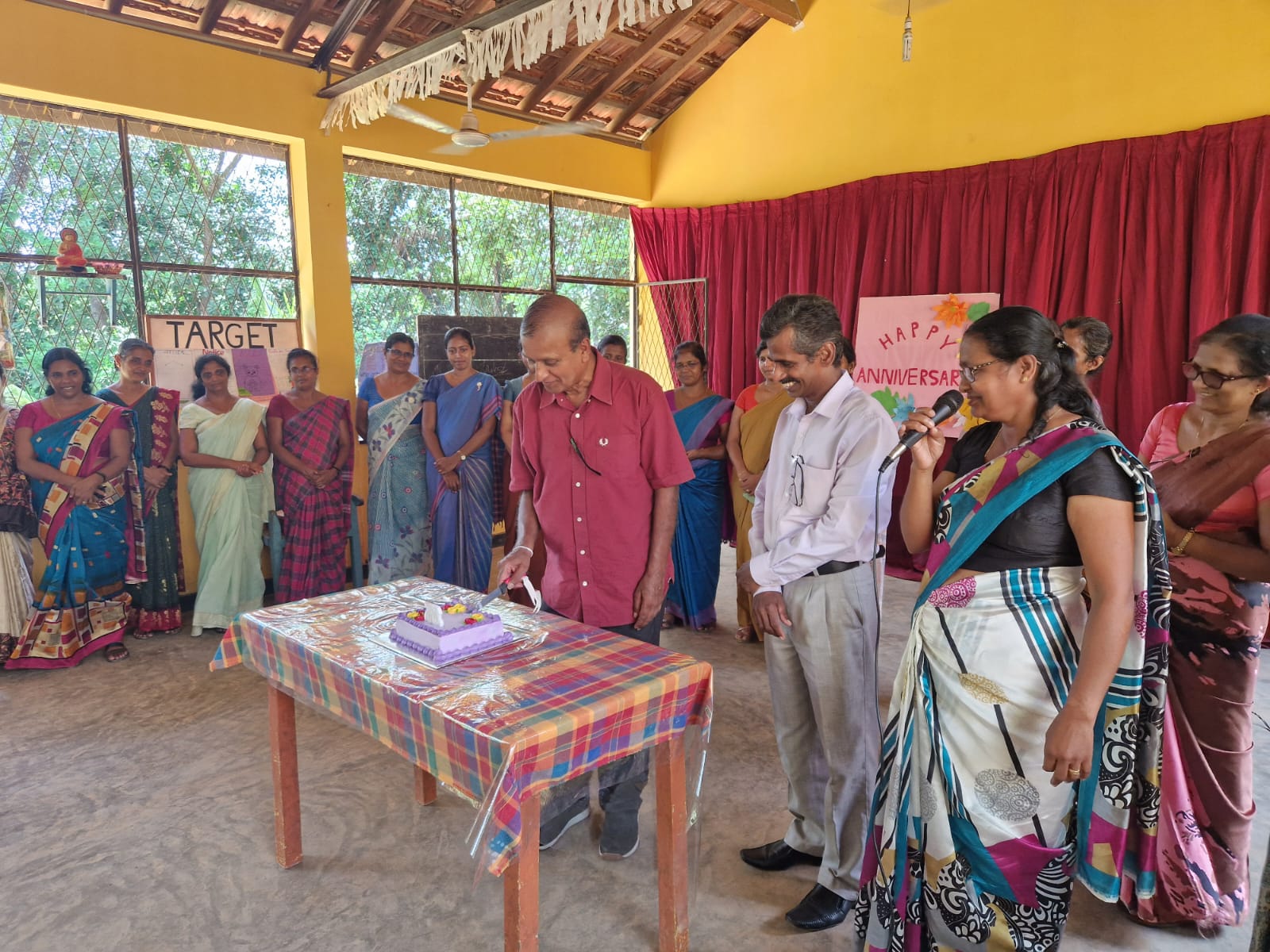 Two days before he went to England, on September 26, he returned to Lenabatua School to say goodbye to the children. Once again Mr Devsiri was warmly welcomed by the principal and the teaching staff. The school had prepared a very beautiful cake for the 35th wedding anniversary of Mr Devsiri and Mrs Ruwini. Mr. Devsiri cut the cake amidst the greetings of the sons and daughters and fed the teachers and children with delicious pieces of cake. Then the children offered Mr Devsiri handmade pretty anniversary cards.